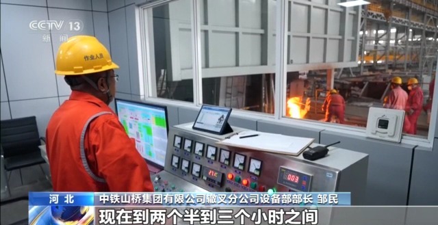 中鐵山橋集團有限公司轍叉分公司設備部部長(cháng) 鄒民:現在的工作間由以前單一的機械操作平臺,變成現在全自動(dòng)的。所有的數據采集,包括能源采集、指標各種元素的反饋、安全報警裝置,由以前多人變成現在就由一個(gè)操作。以前一爐鋼水得煉四個(gè)小時(shí)左右,現在到兩個(gè)半到三個(gè)小時(shí)之間。